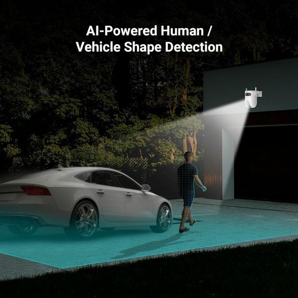 Telecamera a doppia ottica 3+3 MP da esterno, Wi-Fi, Rilevazione cooperativa grazie a obiettivo wide + obiettivo PT. Doppia antenna Wi-Fi. Visione notturna a colori, riconoscimento figura umana e veicoli con IA. Luce strobo e sirena. Supporta schede microSD (fino a 512 GB) |
