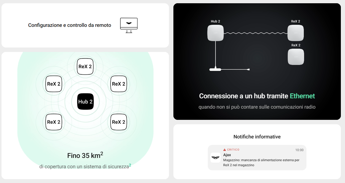 Con l'aggiornamento del sistema operativo OS Malevich 2.13, il ripetitore ReX 2 Jeweller si connetterà all'hub non solo via radio, ma anche via Ethernet, utilizzando il cavo come unico canale di comunicazione o come canale prioritario. Un singolo sistema Ajax può coprire un impianto come un centro uffici con parcheggio sotterraneo, un hangar metallico o un complesso di magazzini composto da più edifici di grandi dimensioni.