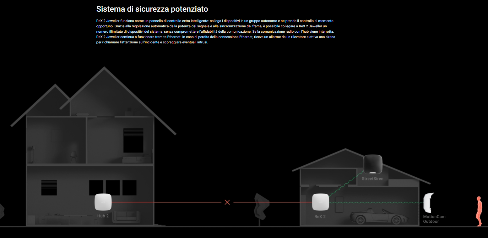 ReX 2 Jeweller funziona come un pannello di controllo extra intelligente: collega i dispositivi in un gruppo autonomo e ne prende il controllo al momento opportuno. Grazie alla regolazione automatica della potenza del segnale e alla sincronizzazione dei frame, è possibile collegare a ReX 2 Jeweller un numero illimitato di dispositivi del sistema, senza compromettere l’affidabilità della comunicazione. Se la comunicazione radio con l’hub viene interrotta, ReX 2 Jeweller continua a funzionare tramite Ethernet. In caso di perdita della connessione Ethernet, riceve un allarme da un rilevatore e attiva una sirena per richiamare l’attenzione sull’incidente e scoraggiare eventuali intrusi.