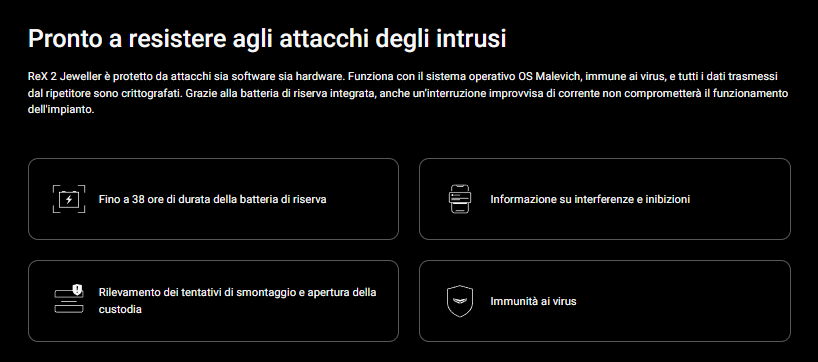 ReX 2 Jeweller è protetto da attacchi sia software sia hardware. Funziona con il sistema operativo OS Malevich, immune ai virus, e tutti i dati trasmessi dal ripetitore sono crittografati. Grazie alla batteria di riserva integrata, anche un’interruzione improvvisa di corrente non comprometterà il funzionamento dell'impianto.