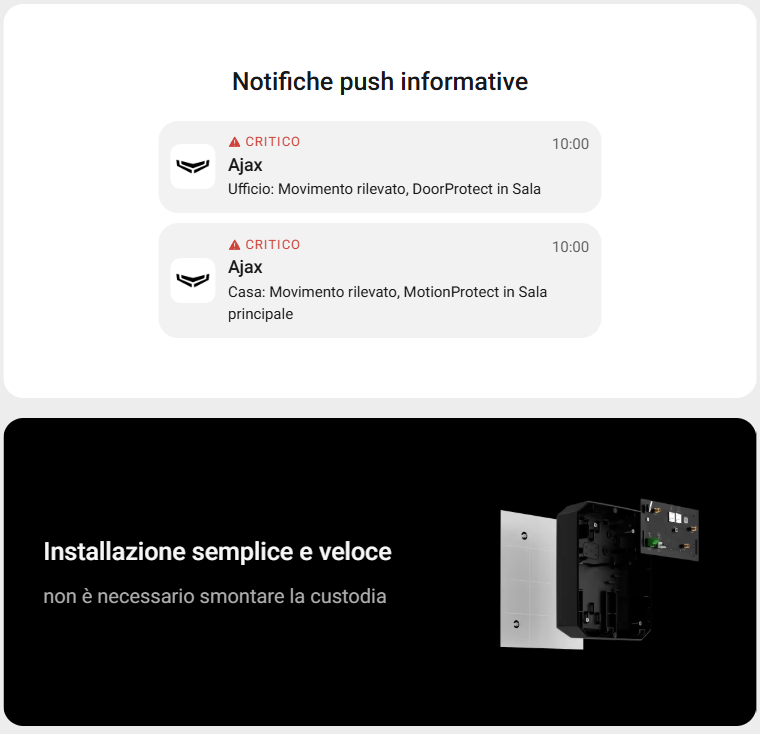 Il sistema Ajax segnala istantaneamente allarmi ed eventi con notifiche informative. Gli istituti di vigilanza e gli utenti ricevono dettagli precisi, tra cui il dispositivo che ha attivato l'allarme, il momento e il luogo in cui si è verificato.