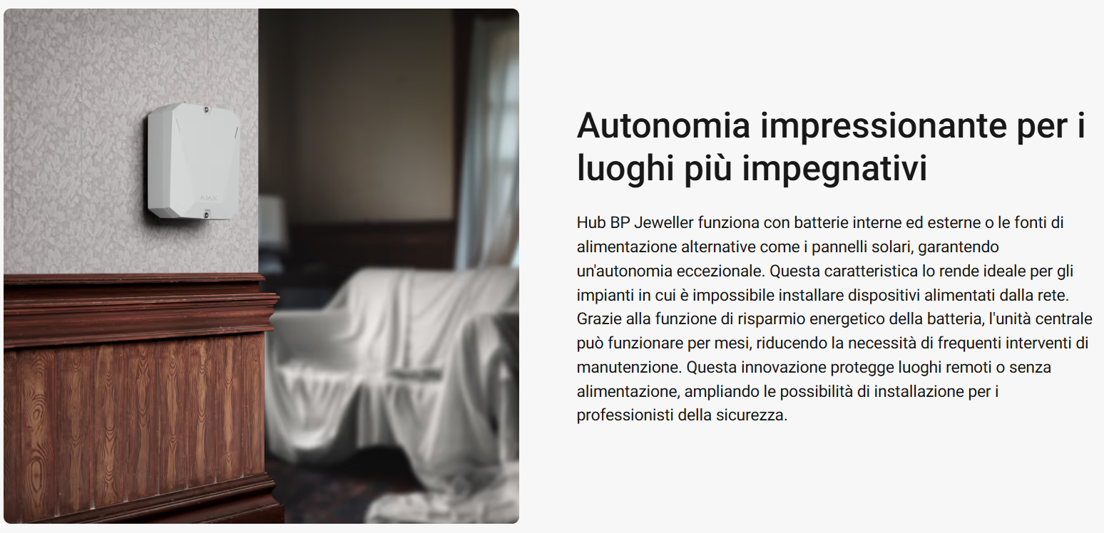 La funzione avanzata di Hub BP Jeweller, applicabile sia alle batterie interne che a quelle esterne, prolunga notevolmente la vita utile. Il risparmio energetico della batteria riduce al minimo gli interventi di manutenzione e i costi, in particolare per gli impianti remoti o di difficile accesso, migliorando l'efficienza e l'affidabilità complessiva del sistema.