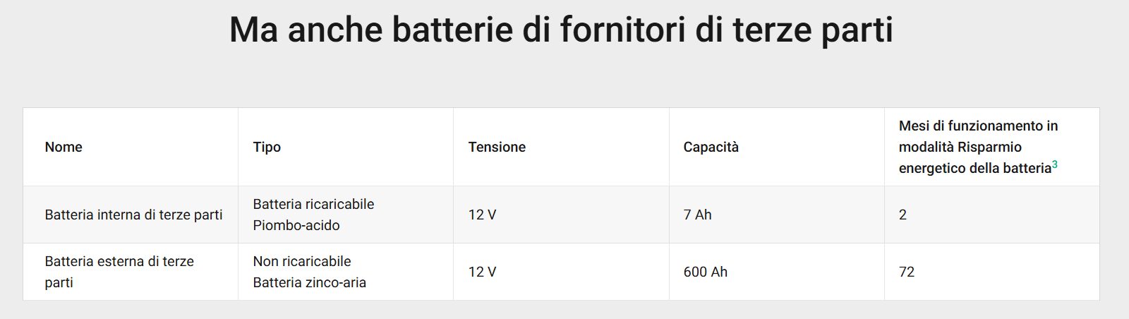 fino a 1,5 anni con batteria esterna zinco-aria di terze parti 12V/600Ah in modalità di funzionamento completo