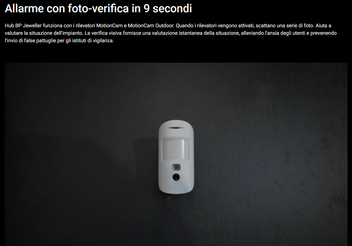 Hub BP Jeweller funziona con i rilevatori MotionCam e MotionCam Outdoor. Quando i rilevatori vengono attivati, scattano una serie di foto. Aiuta a valutare la situazione dell'impianto. La verifica visiva fornisce una valutazione istantanea della situazione, alleviando l'ansia degli utenti e prevenendo l'invio di false pattuglie per gli istituti di vigilanza.