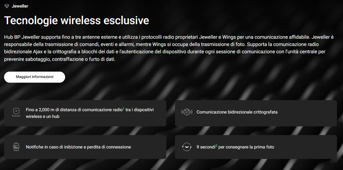 Hub BP Jeweller supporta fino a tre antenne esterne e utilizza i protocolli radio proprietari Jeweller e Wings per una comunicazione affidabile. Jeweller è responsabile della trasmissione di comandi, eventi e allarmi, mentre Wings si occupa della trasmissione di foto. Supporta la comunicazione radio bidirezionale Ajax e la crittografia a blocchi dei dati e l'autenticazione del dispositivo durante ogni sessione di comunicazione con l'unità centrale per prevenire sabotaggio, contraffazione o furto di dati.