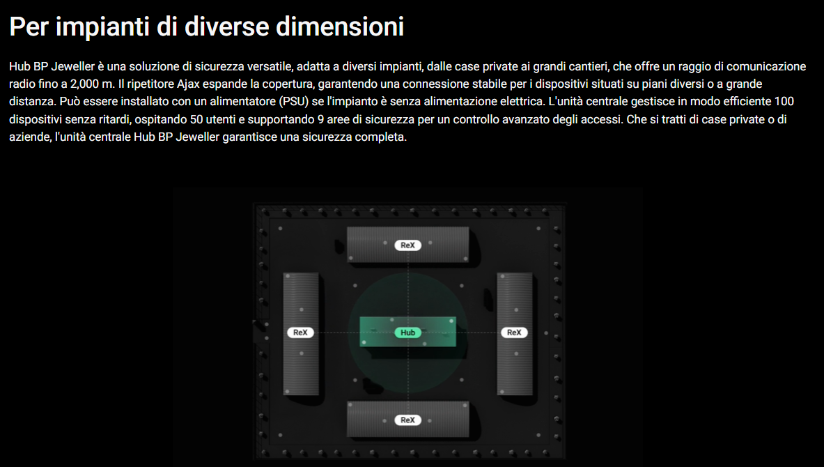 Hub BP Jeweller è una soluzione di sicurezza versatile, adatta a diversi impianti, dalle case private ai grandi cantieri, che offre un raggio di comunicazione radio fino a 2,000 m. Il ripetitore Ajax espande la copertura, garantendo una connessione stabile per i dispositivi situati su piani diversi o a grande distanza. Può essere installato con un alimentatore (PSU) se l'impianto è senza alimentazione elettrica. L'unità centrale gestisce in modo efficiente 100 dispositivi senza ritardi, ospitando 50 utenti e supportando 9 aree di sicurezza per un controllo avanzato degli accessi. Che si tratti di case private o di aziende, l'unità centrale Hub BP Jeweller garantisce una sicurezza completa.